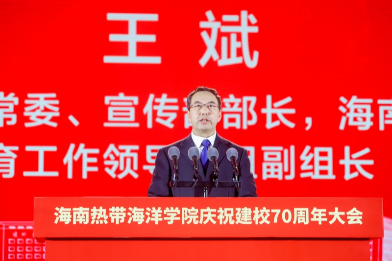 王斌代表海南省委、省政府,向全校师生员工和海内外校友表示热烈的祝贺,向长期以来关心海南热带海洋学院、支持海南自由贸易港建设的各位领导和各界朋友们表示衷心的感谢!王斌表示,学校建校70年来,始终扎根琼州大地兴教育人,坚持与民族共命运,坚持与时代同步伐,坚持立足海南、面向南海、面向东盟,服务国家海洋强国战略、“一带一路”和海南自贸港建设,为推动琼中琼南地区教育事业发展、夯实民族团结进步根基、促进地区经济社会发展作出了重要贡献。学校转海发展,填补了海南海洋大省没有海洋大学的空白。近10年来,学校在涉海人才培养、师资队伍建设、学科专业建设、科学研究等方面取得了显著成效,构建了海洋类学科专业的四梁八柱,办学水平拾级而上,办学特色日益鲜明,办学方向更加明确,受到社会各界广泛好评。