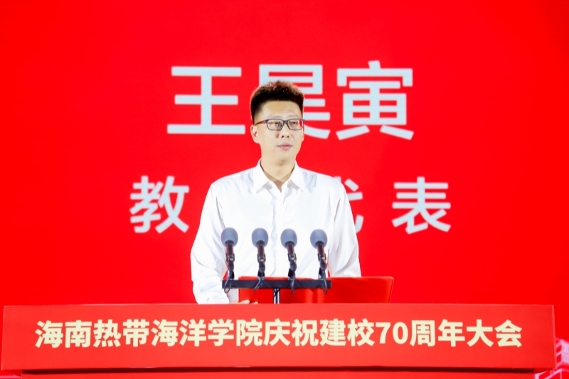 教师代表海洋科学技术学院王昊寅在发言中深情回忆了和学校一起成长的岁月,表达了对学校的拳拳祝福。他表示,全体教师将继续努力培养更多胸怀蓝色梦想、堪当时代重任的优秀海洋人才,为海南自贸港建设而努力奋斗,为建设教育强国、海洋强国,实现中华民族伟大复兴作出更大的贡献。