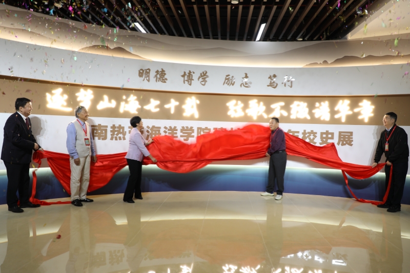 原琼州大学党委书记华子奇,原琼州学院党委书记谭照耀,海南省人大常委会副主任、我校校友、原琼州学院副校长、海南热带海洋学院原副校长过建春,原海南省教育厅一级巡视员、我校校友、原琼州学院党委副书记、校长武耀廷,海南热带海洋学院党委书记陈锐共同为建校70周年校史展揭牌。揭牌仪式结束后,全体人员参观了校史展。