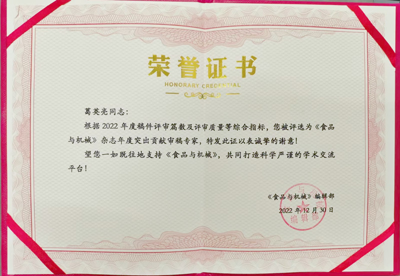 近日,中国食品科学技术学会会刊、北大中文核心期刊《食品与机械》从262名常任审稿专家中综合论文评审质量、数量等指标遴选10名专家,授予《食品与机械》2022年度“突出贡献审稿专家”荣誉称号。我校食品科学与工程学院副教授葛英亮获得该项荣誉,此为葛英亮在2021年获《食品研究与开发》(中文核心期刊)授予“优秀审稿专家”后,再次被中文核心期刊授予荣誉称号,极大地提高了我校食品类专业在食品领域内的学术影响力。