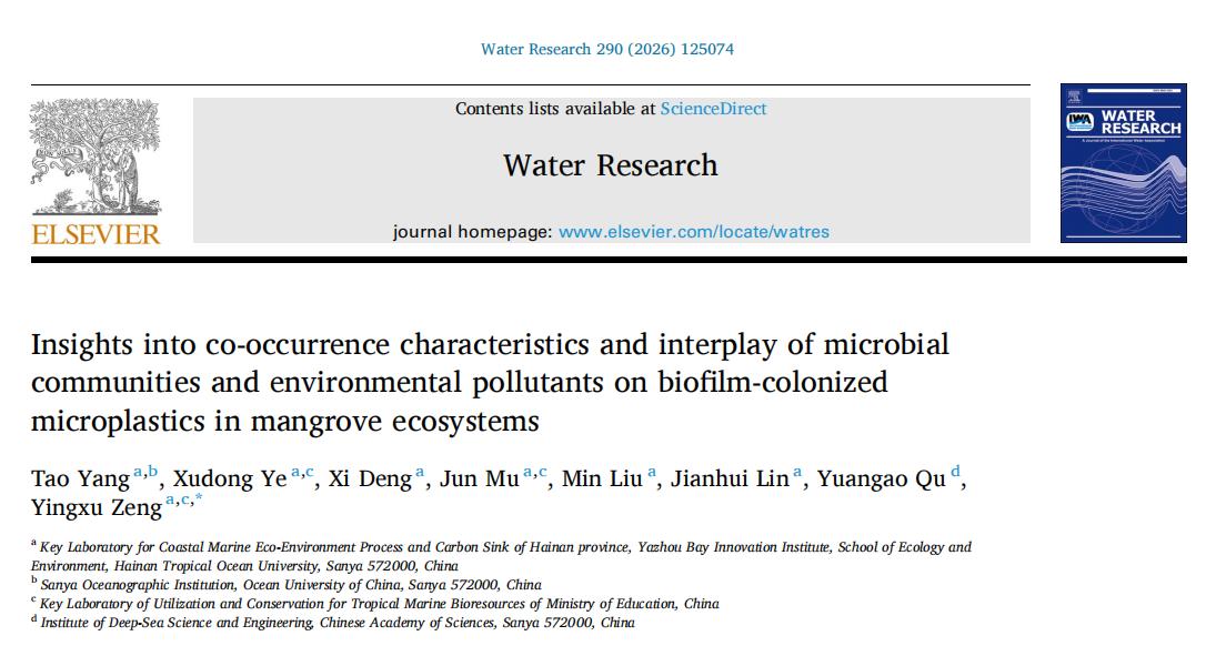近日,生态环境学院曾映旭教授团队在国际环境领域顶级期刊Water Research(中科院ITOPNature Index期刊,IF=12.4)上发表了立足海南自贸港国家生态文明试验区建设的研究成果Insights into co-occurrence characteristics and interplay of microbial communities and environmental pollutants on biofilm-colonized microplastics in mangrove ecosystems,揭示了典型热带海洋生态系统中生物膜微塑料协同富集微生物、重金属及持久性污染物的复杂过程与驱动机制。该期刊由国际水协会(International Water Association主办,创刊于1967年,环境科学与生态学领域最具权威性的期刊之一。
