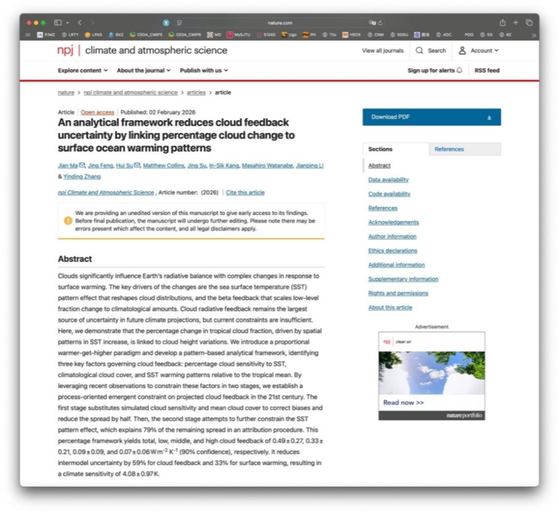 2月2日,我校崖州湾创新研究院暨海洋科学技术学院马建教授作为第一作者(兼通讯作者),带领其上海交通大学的博士冯静(共同第一作者)、研究助理张寅丁,联合香港科技大学苏慧教授(共同通讯作者),英国Exeter大学Matthew Collins教授、崖州湾创新院苏静副教授、自然资源部第二海洋研究所/韩国首尔国立大学In-Sik Kang教授、日本东京大学Masahiro Watanabe教授以及中国海洋大学李建平教授,Nature旗下期刊npj Climate and Atmospheric Science发表研究论文An analytical framework reduces cloud feedback uncertainty by linking percentage cloud change to surface ocean warming patterns。该期刊以“严选具有范式重构潜力的前瞻成果”著称,是Nature旗下权威期刊,中科院SCI期刊分区1区,影响因子9.4,我校为第一署名单位。此次发表(图1)针对全球学界公认的气候变化领域最前沿的科学问题,即全球云反馈的根本特和涌现约束,从大气动力过程向地球辐射效应进行跨界研究,揭秘了创新理论范式“比例暖者更高”,并给出高效两段式决方案,突破性地将模式之间的不确定性降低了59%。