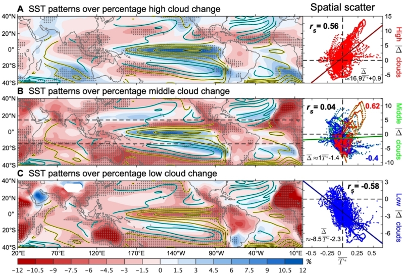 图2.各云型百分比云量变化的水平分布(彩色;%),包括(A)高云、(B)中云和(C)低云,与海表增暖型(等值线;K;间隔0.1 K)的对比(左),以及它们的空间散布(右)。左图中阴影区域的集合平均百分比云量变化超过了模式间标准差,而右图显示云与海表温度的空间相关系数以及线性拟合参数。