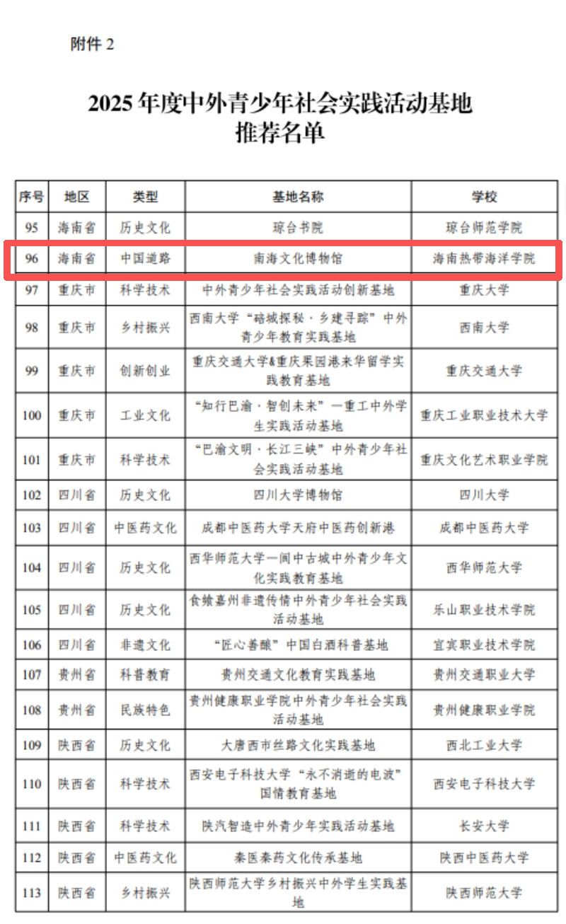 近日,中国教育国际交流协会正式公布“2025年度来华留学生国情教育优秀课程和中外青少年社会实践活动基地”推荐名单。全国共121门课程、124个基地成功入选。我校申报的《走进海南自由贸易港——来华留学生国情教育与实践》课程入选来华留学生国情教育优秀课程(综合概括类),南海文化博物馆入选中外青少年社会实践活动基地。此次双项入选,实现了我校在国家级来华留学生国情教育精品课程认定上“零的突破”。